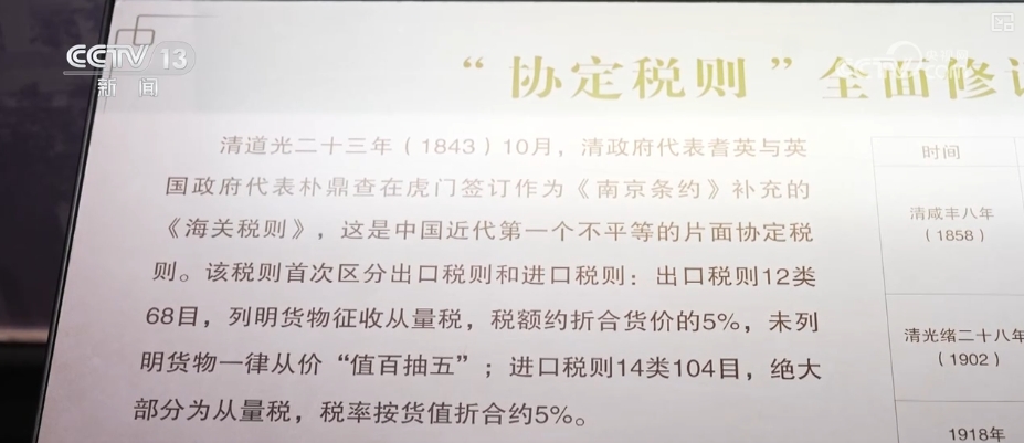 粤海关博物馆办事队陈晓旋引见,海关一曲施行的是全面的协定税则,协定税则也就是我们的税则和税率都要颠末外国人的同意和核准。反映了列强正在经济上对中国的侵略以及弱国无交际的现实环境。